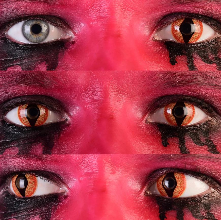 Design features a transparent cat eye pupil down an opaque orange with a reptile pattern of yellow and red colour combination on the iris.