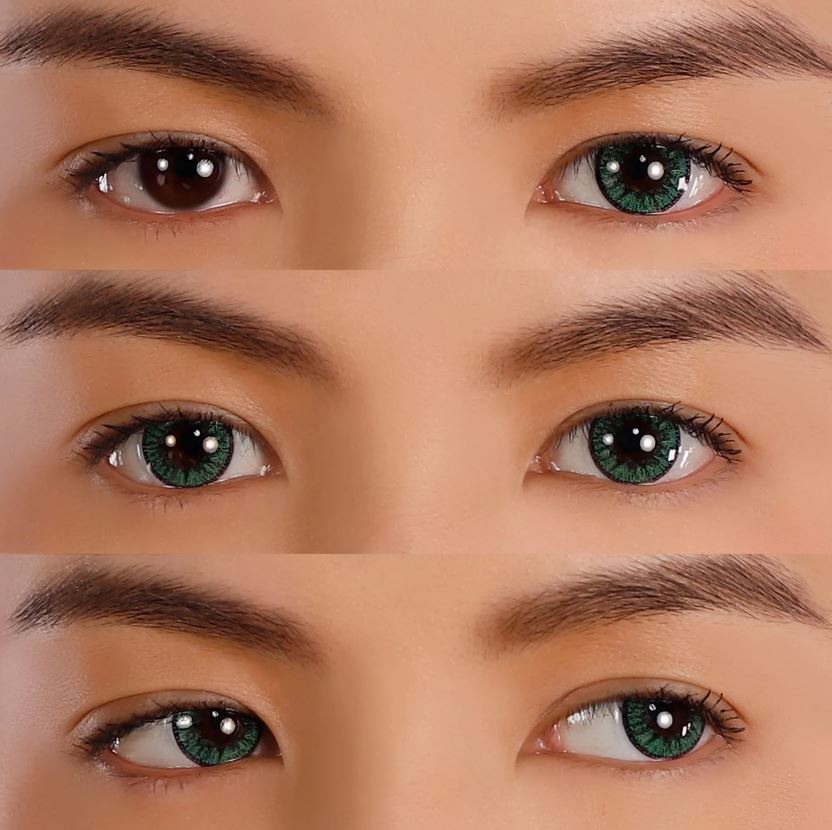 Lenses feature a deepl colored mix of vivid green and bright blue accents that meets a darker outer ring. On light natural eyes, the lenses add a very saturated layer of intense green with contrasting darker stripes.