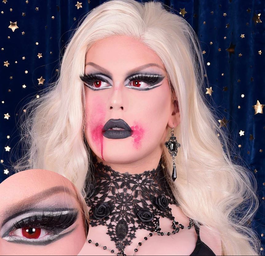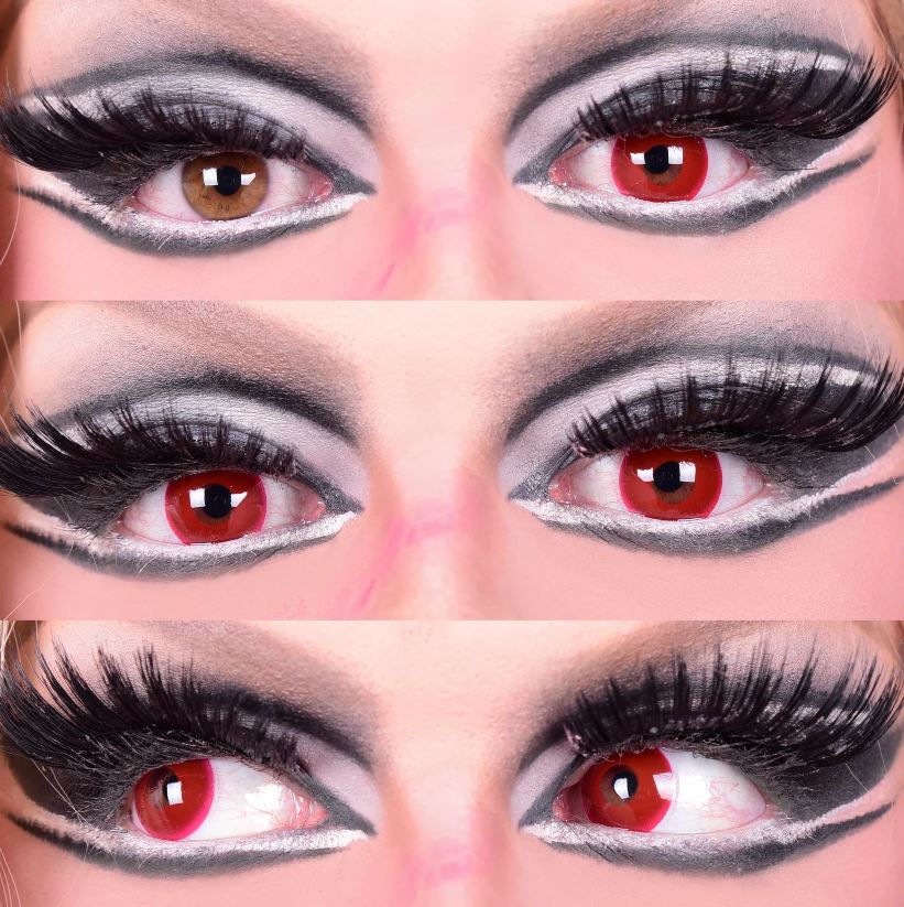 Contact lenses features a transparent pupil and opaque bright blood red iris.