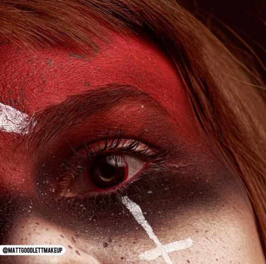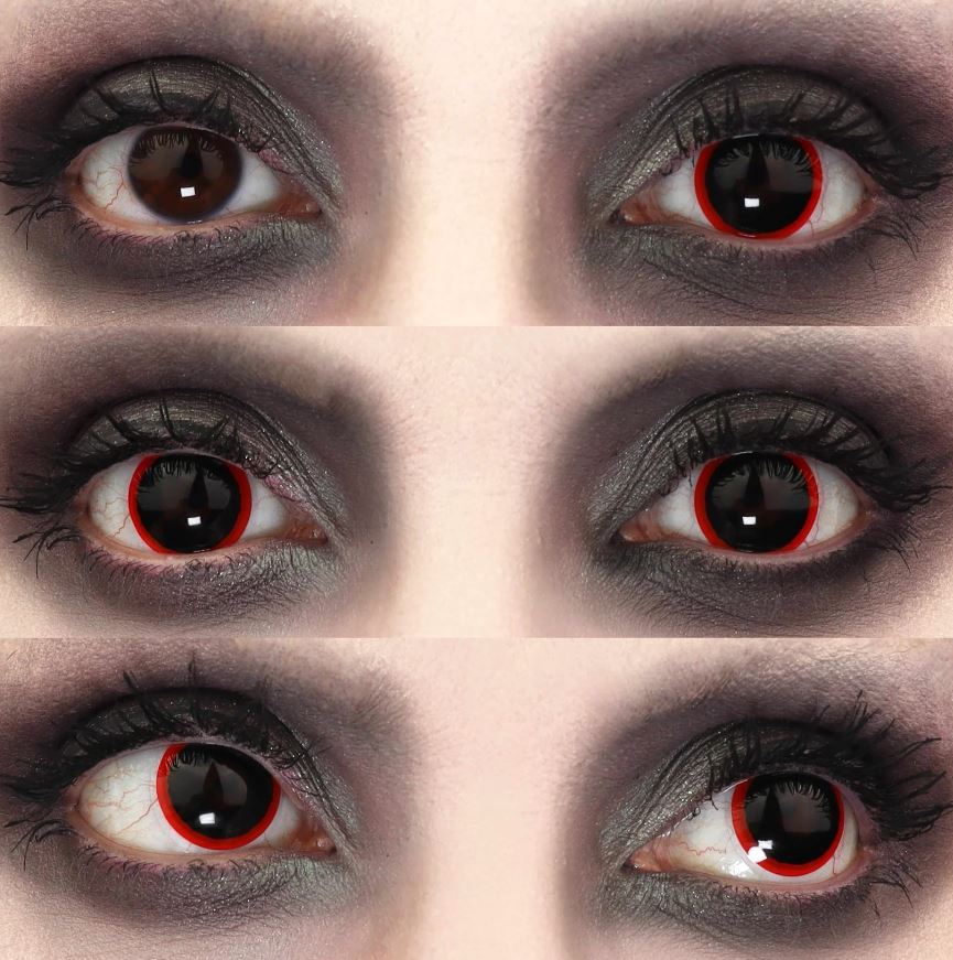 Lenses feature a transparent pupil with an opaque black iris and red outer ring. This design widens eyes and gives a dramatic possessed look.