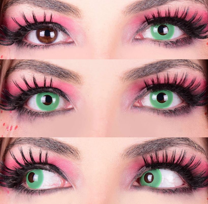 Contact lenses features a bright neon green opaque iris and transparent pupil.
