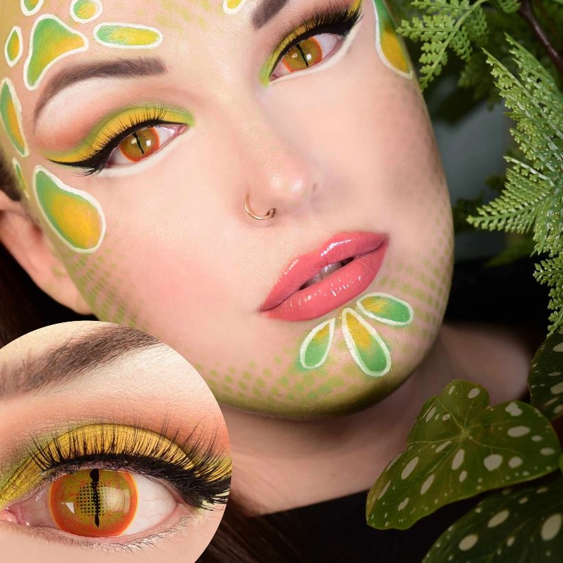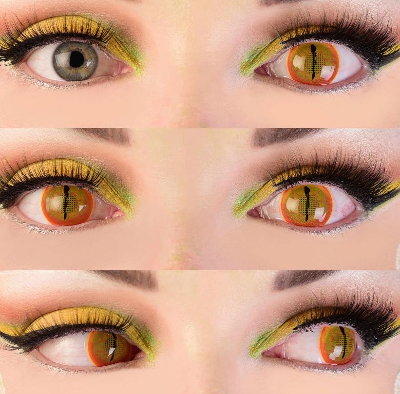 Features a completely covered iris and pupil. A yellow base with orange veins interior on a mesh pupil allowing for vision. This is "Mesh” model lens which covers your pupils, driving is not permitted, especially not at night, as these contacts will reduce and limit your field of vision.