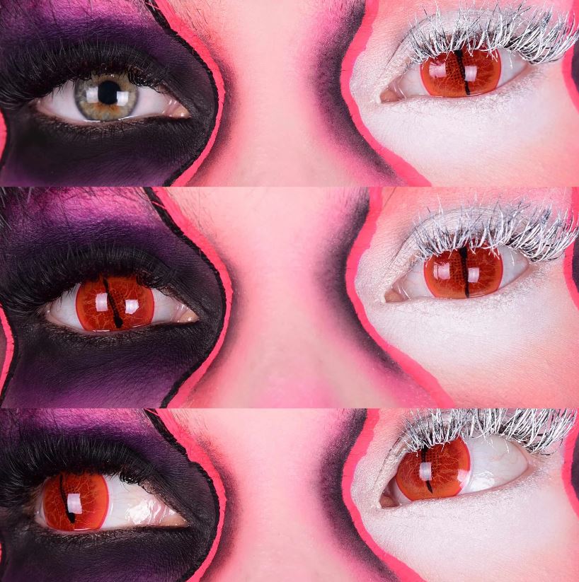 Features a completely covered iris and pupil. A red base with orange veins interior on a mesh pupil, allowing for easy vision, with an orange-yellow outer ring.This is "Mesh” model lens which covers your pupils, driving is not permitted, especially not at night, as these contacts will reduce and limit your field of vision.