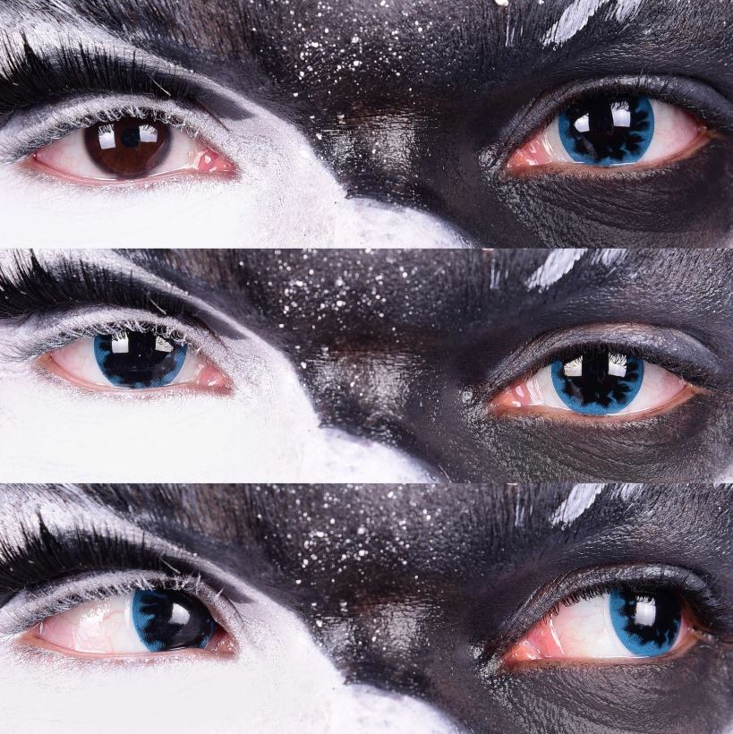 features an opaque black base being over taken by a pattern of blue smoke cloud. This is "Mesh” model lens which covers your pupils, driving is not permitted, especially not at night, as these contacts will reduce and limit your field of vision.