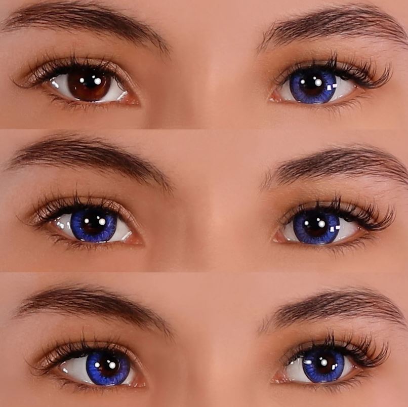 Feature a deeply textured mix of intense blue and purple shades throughout the iris, extending to a subtle outer ring. On light natural eyes, these colored contact lenses have a soft and very saturated effect. The dark accents are really highlighted when the MOONLIGHT AZURE lenses are worn on dark natural eyes, giving the indigo irises surprising depth.