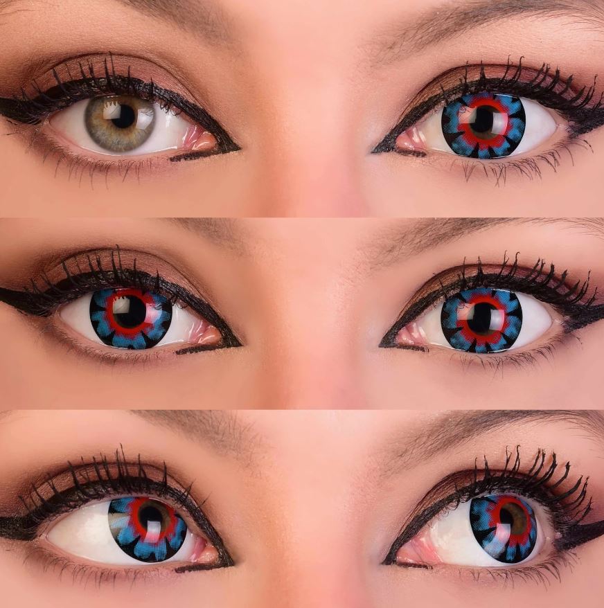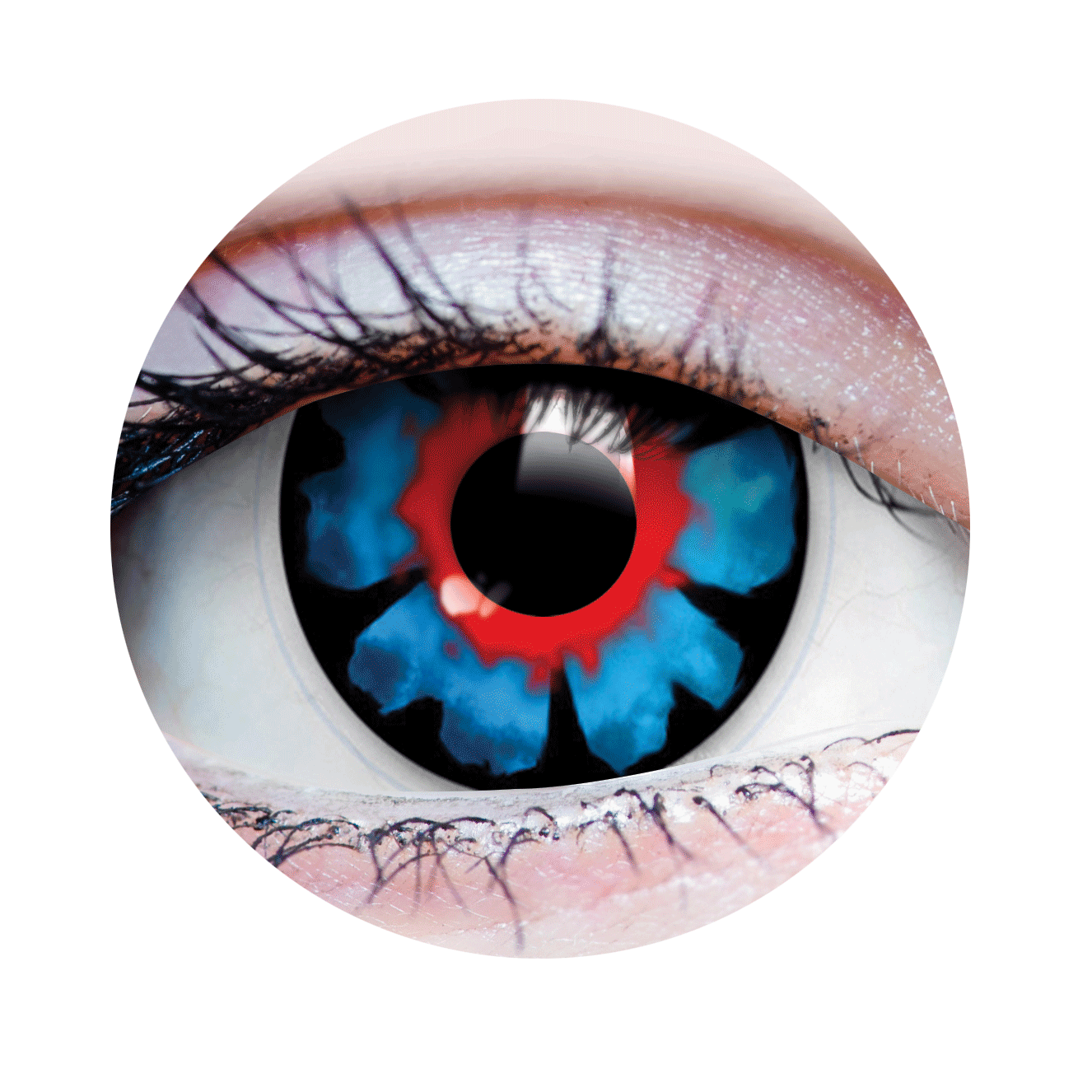 Design features a red rim around the pupil, dark blue over the iris and black outer rim that intercepts the blue creating a flower petal effect.