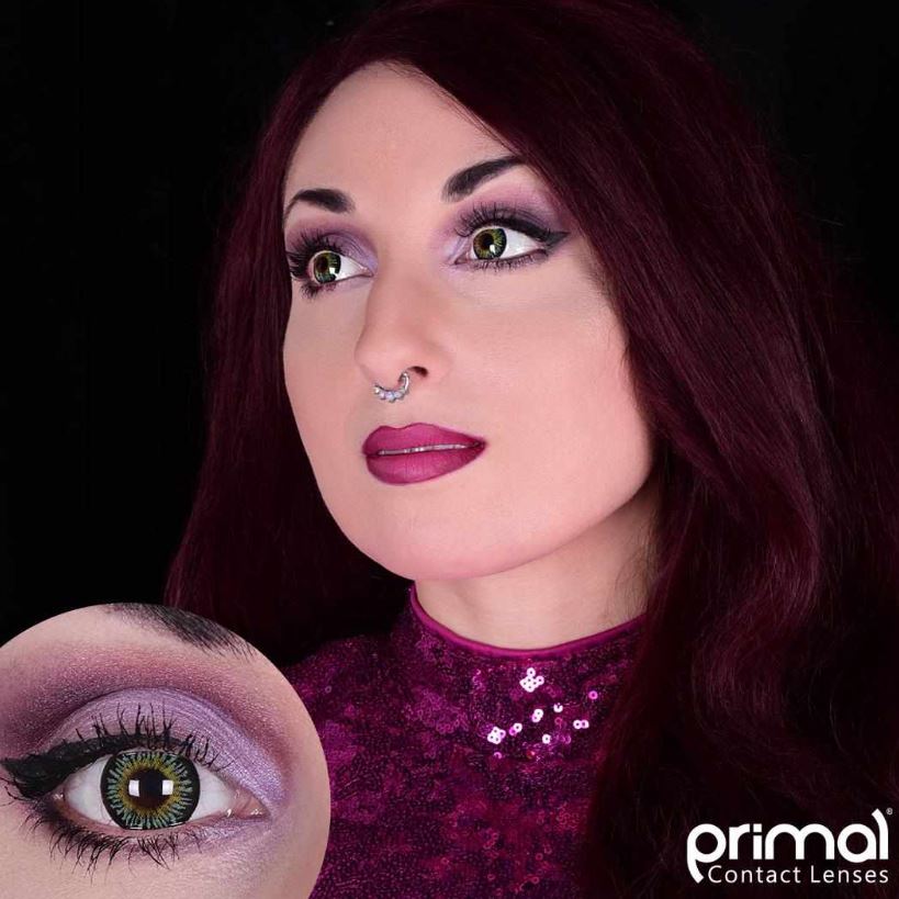 Lenses feature a pattern starting with warm yellow highlighting the pupil, and radiating in green hues through the iris to meet a dark outer ring. On both light and dark natural eyes, the lenses create a bright contrast, with the green of the iris and the yellow of the center playing off of each other.
