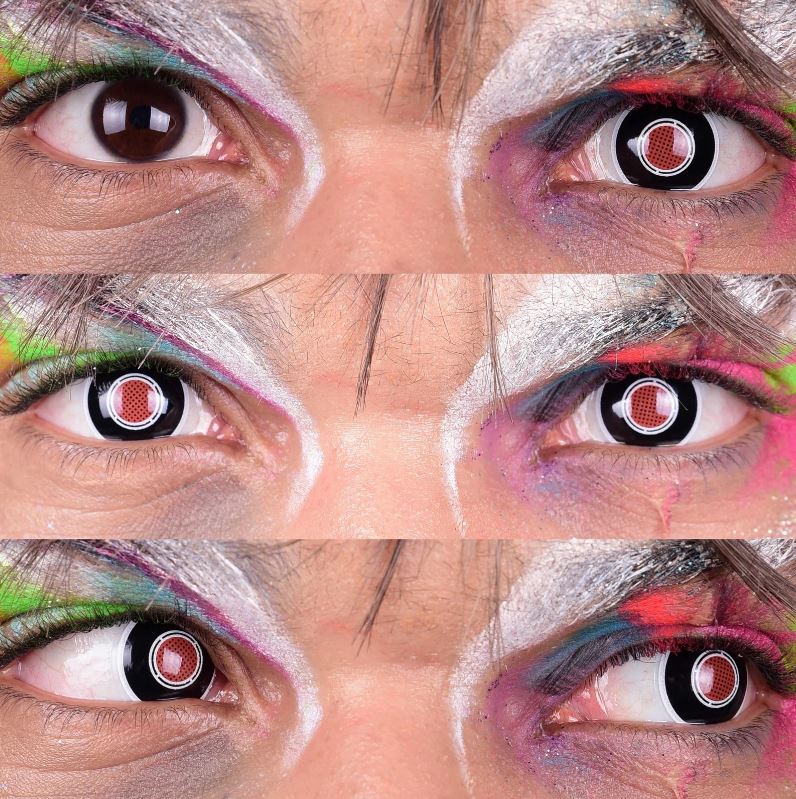 Features an opaque black base, thin white outer rim and a red mesh over pupils. The pupil is contoured with a design illustrating a mechanical look. This is "Mesh” model lens which covers your pupils, driving is not permitted, especially not at night, as these contacts will reduce and limit your field of vision.