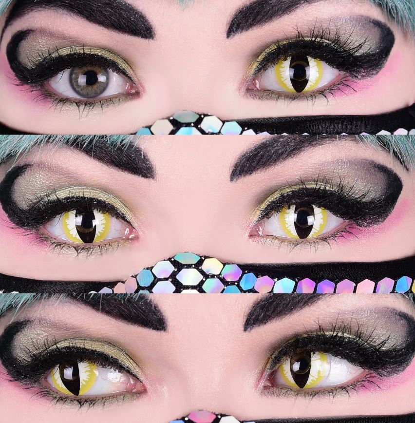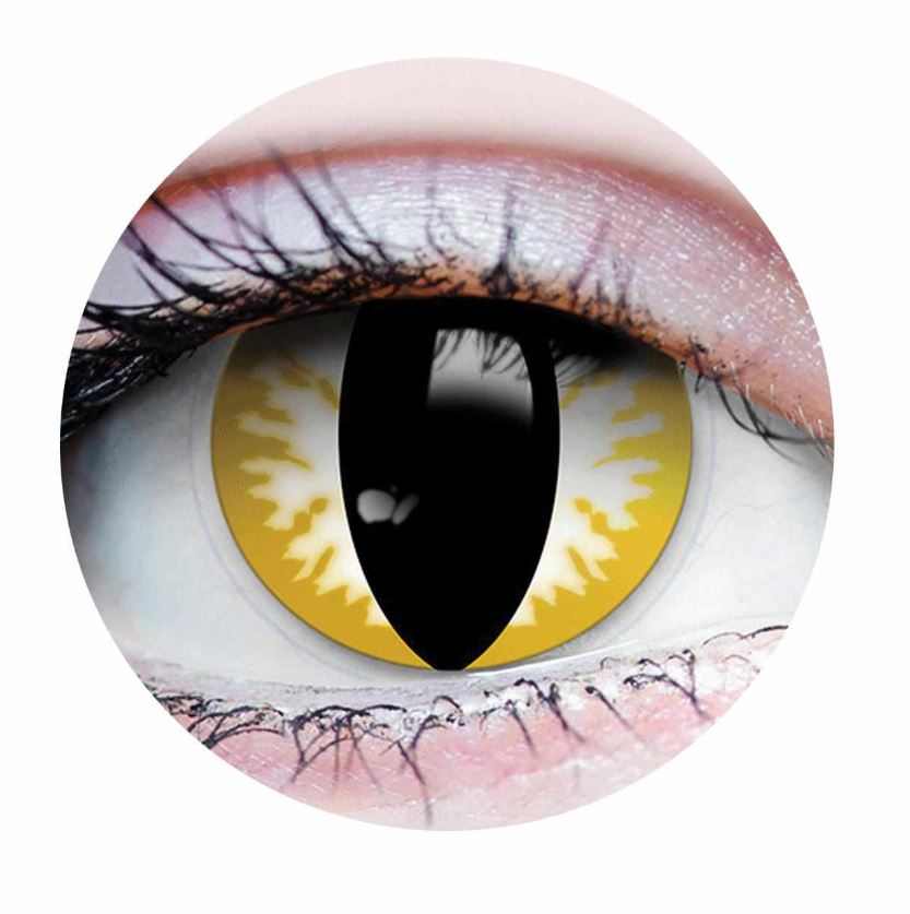Lens features a black slit pupil effect down the center of the lens. Yellow and white opaque sides with a transparent pupil allows for easy vision.