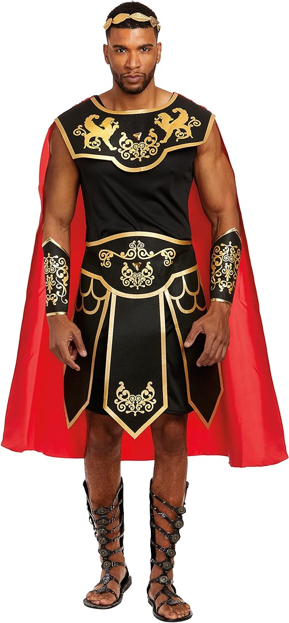Includes: Embellished foil-printed collar with attached satin cape, foil printed skirt and Gauntlets, sleeveless shirt and gold leaf headpiece.