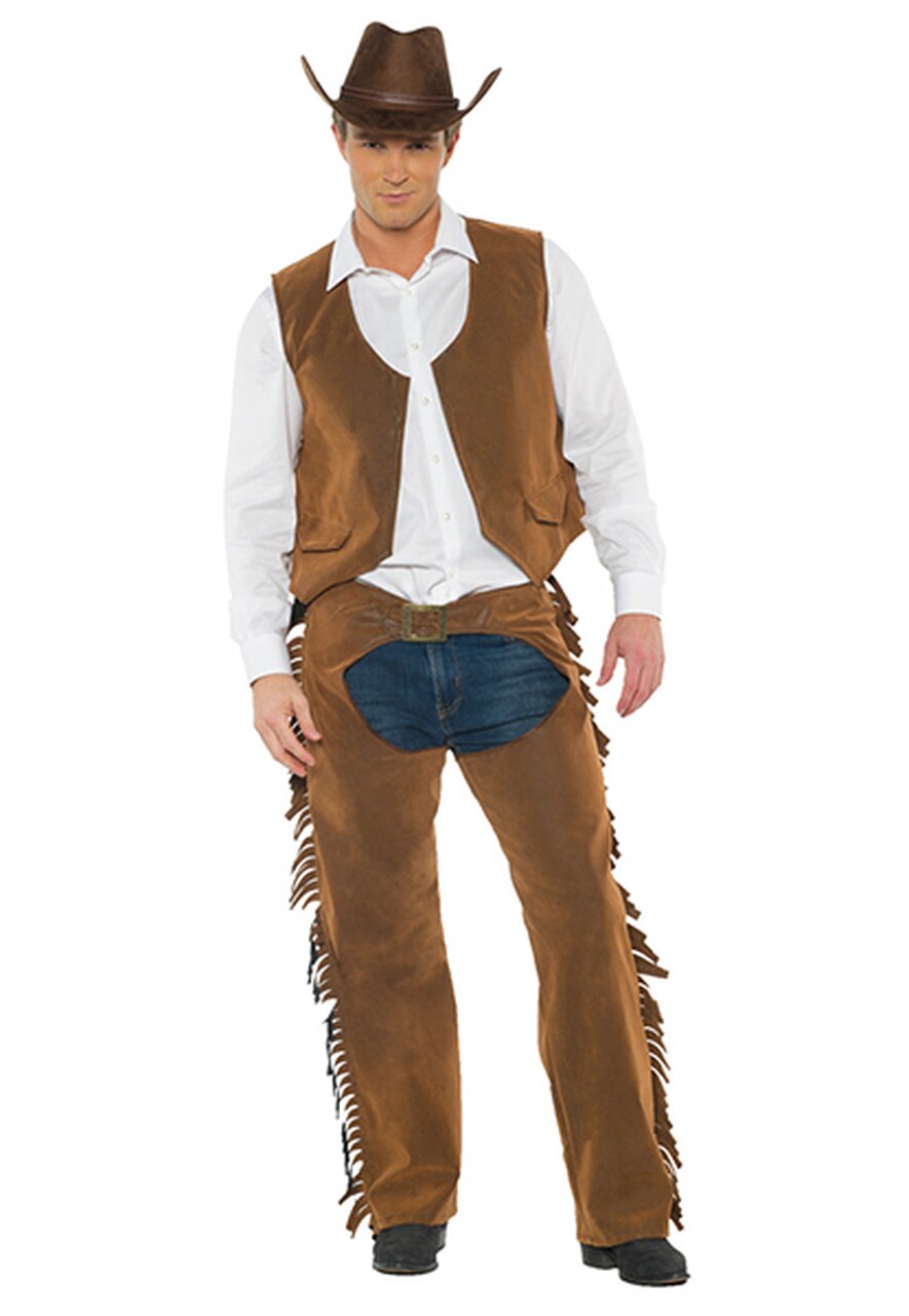 Includes: Cowboy-look vest with matching chaps with attached fringe..