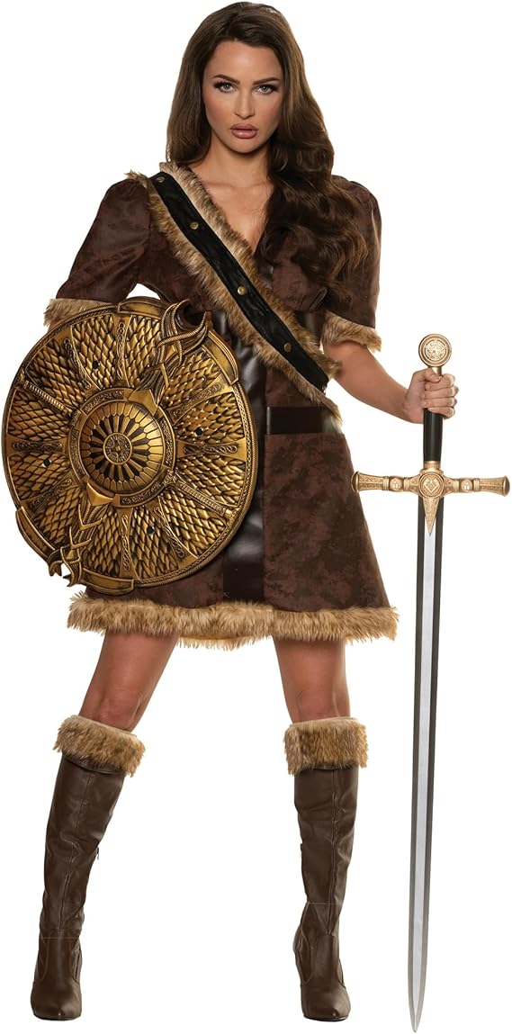 Fur trimmed mini dress with attached fur trimmed cross strap and boot top covers. Sword and shield not included.
