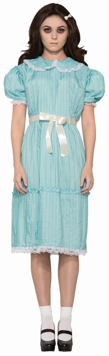 Light blue polka dot dress with puff sleeves and ribbon waist tie back. Fits bust 36"-38", waist 27"-30".